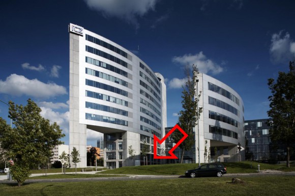 V přízemí červené věže budovy Office Park Kavčí Hory (Na hřebenech II 1718/10, Praha 4).